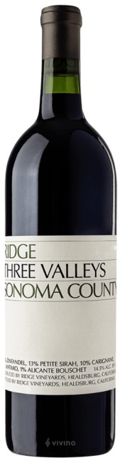 Made since 2001 from a number of Sonoma County vineyards, the 2023 Three Valleys blends 71% Zinfandel, 16% Carignane, 9% Petite Sirah, 2% each Mataro and Alicante Bouschet from Alexander Valley, Dry Creek Valley, Sonoma Valley, and Russian River Valley. Floral, it is complex and less rustic than usual, the vintage showing classic charm and elegance. Though it is one of Ridge's largest production wines, it is made in the exact same way as all its others, in open top tanks with real oak and native fermentations. It's meant to represent a vintage more than a location. A popular by-the-glass pour, order it when you see it.